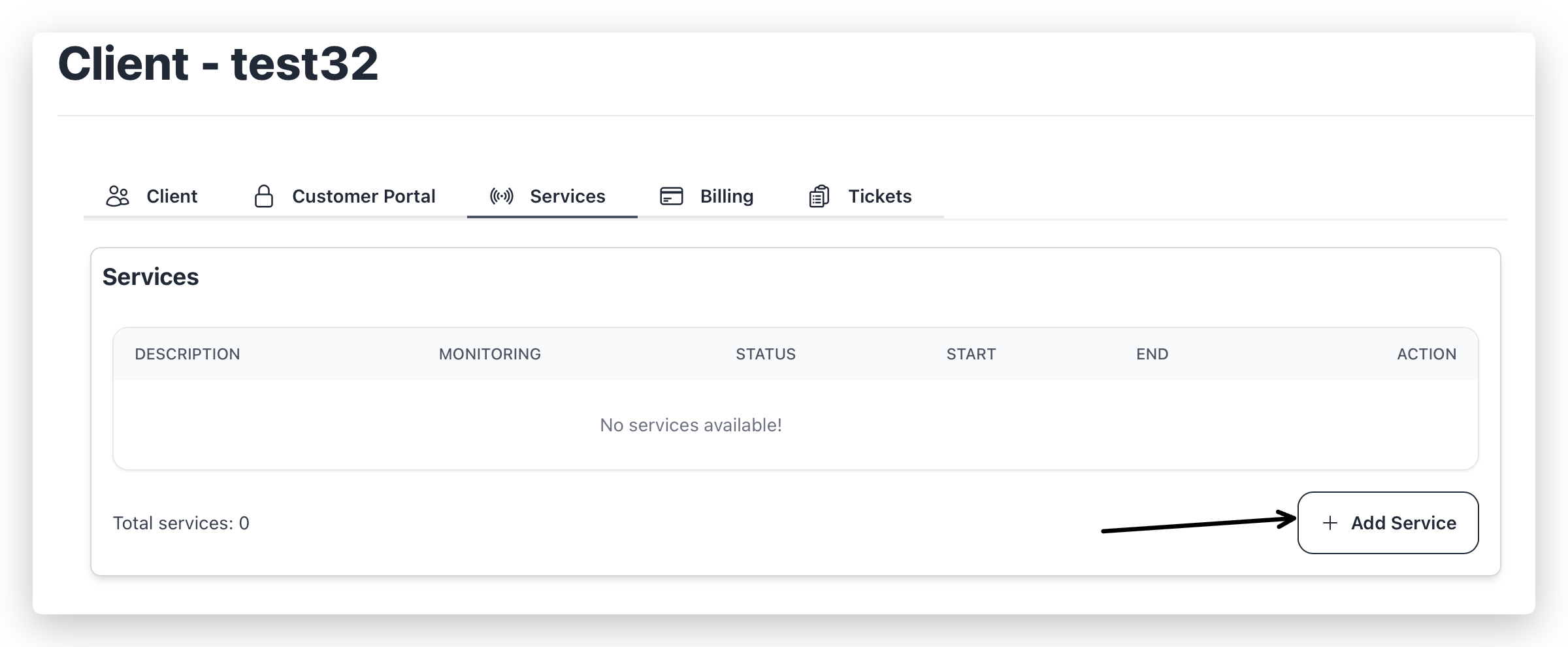 1. Open Clients -> View Client -> Services and click + Add Service.