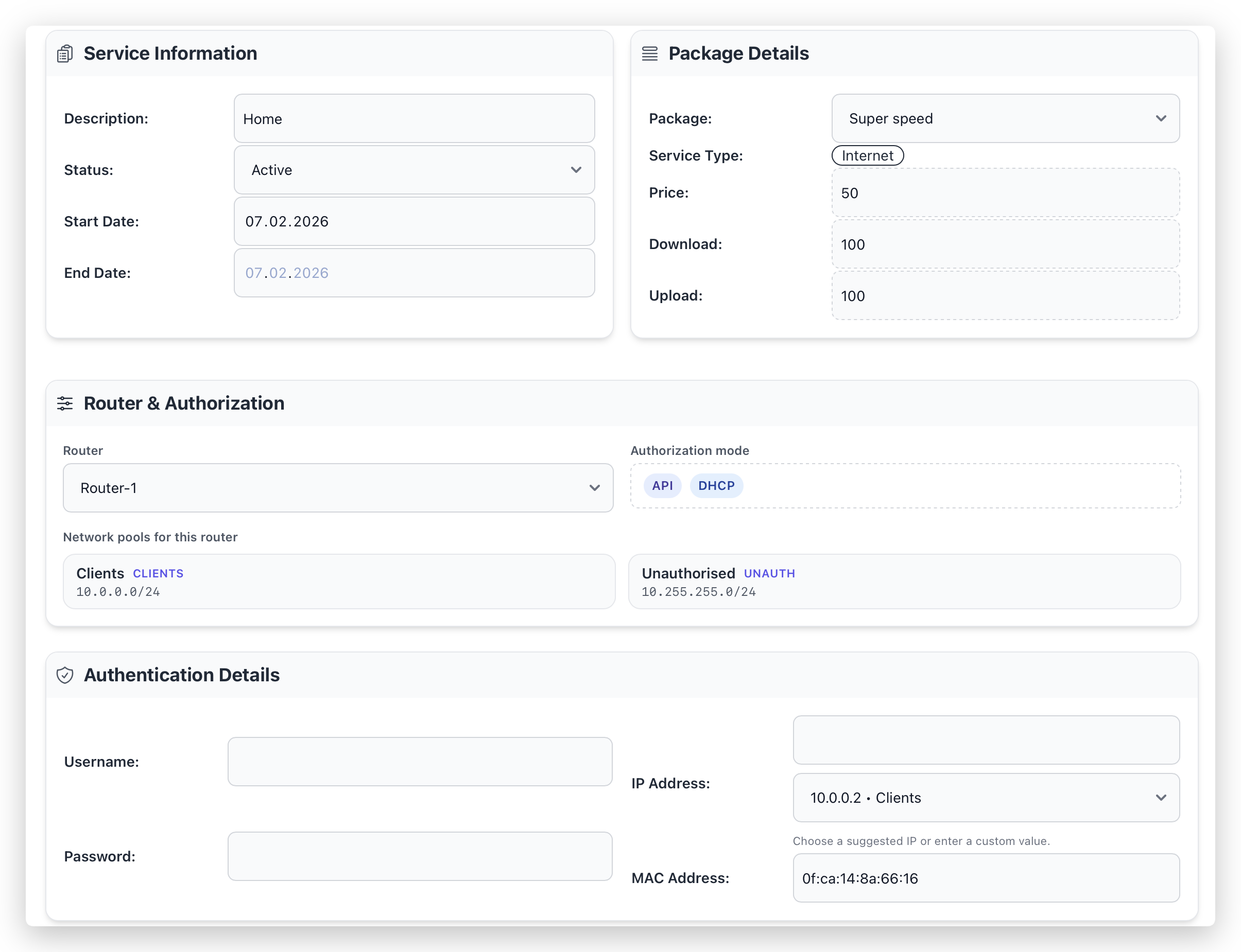 Learn how to add a service in ISPBox: choose package and router, enter authentication details, create the service, and optionally assign equipment during setup.