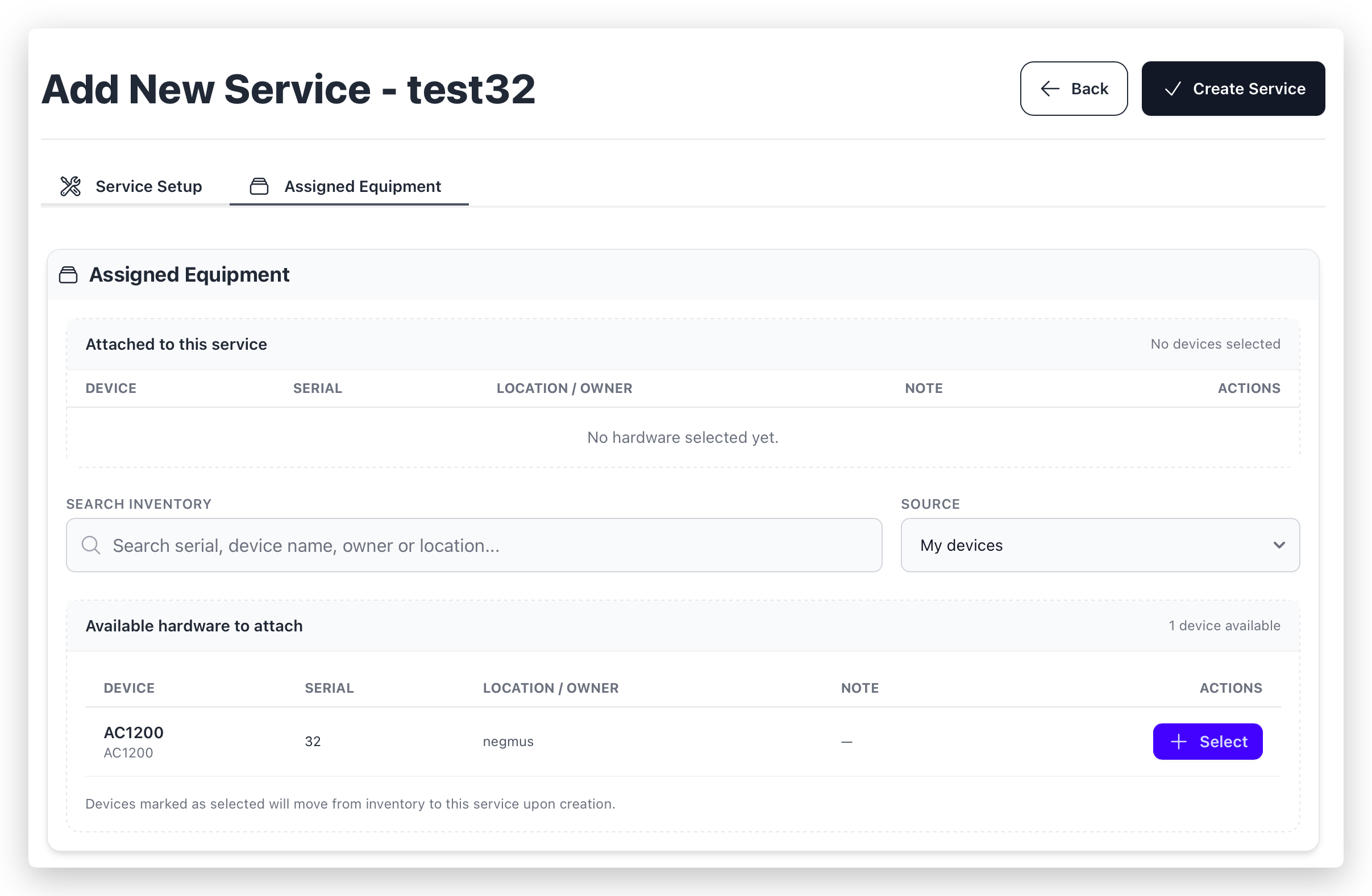 Selected devices are attached during service creation and moved from stock/user ownership to the service.