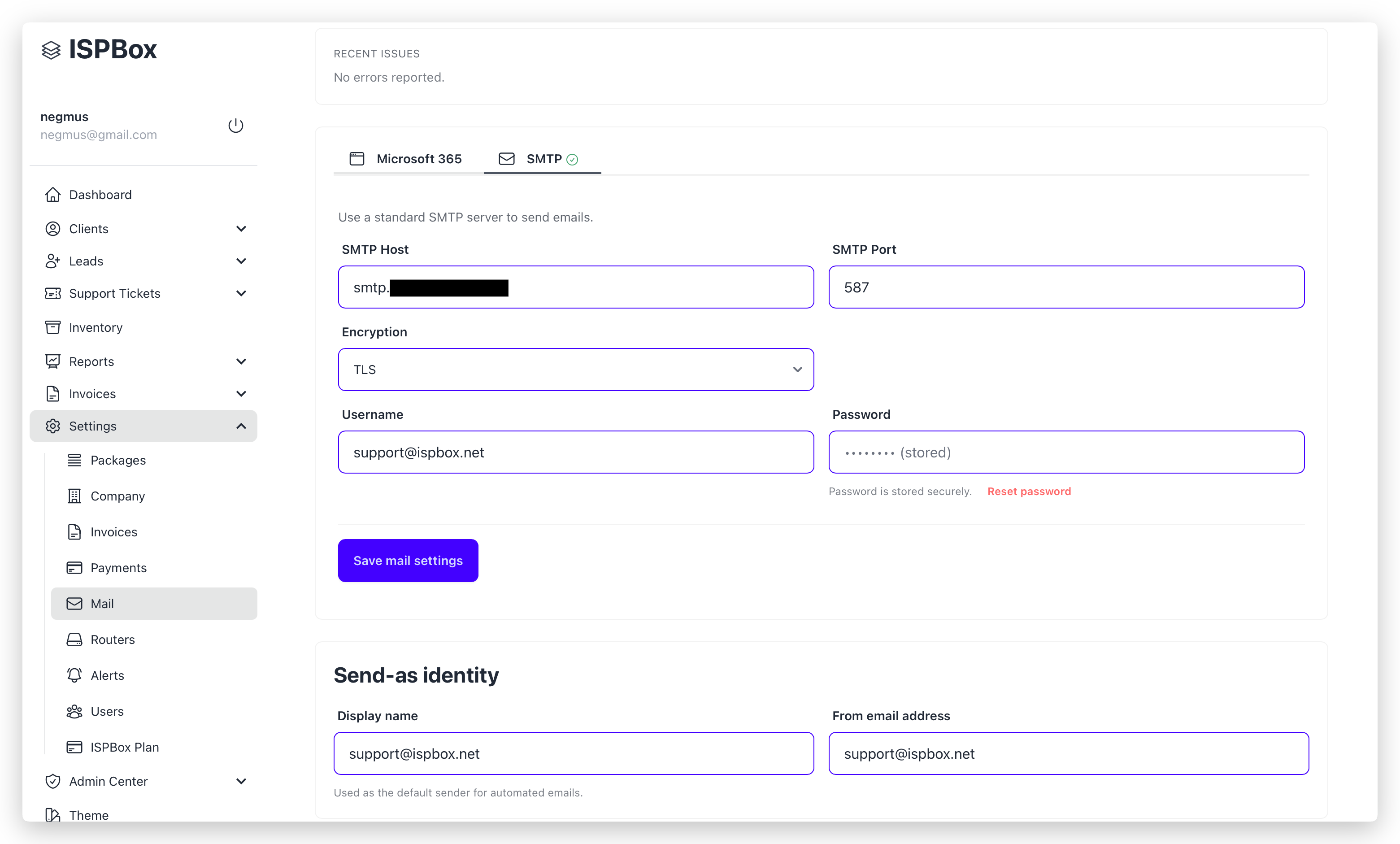 Set up SMTP in ISPBox to send system emails, configure sender identity, store credentials securely, and verify delivery with a test email.